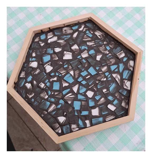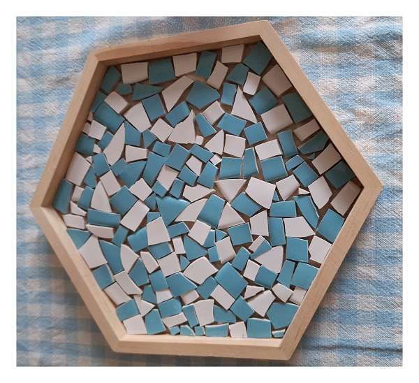 Ik heb eerst het bord met een hamer in kleine stukjes geslagen. ( leuk werkje om even lekker te mogen meppen)